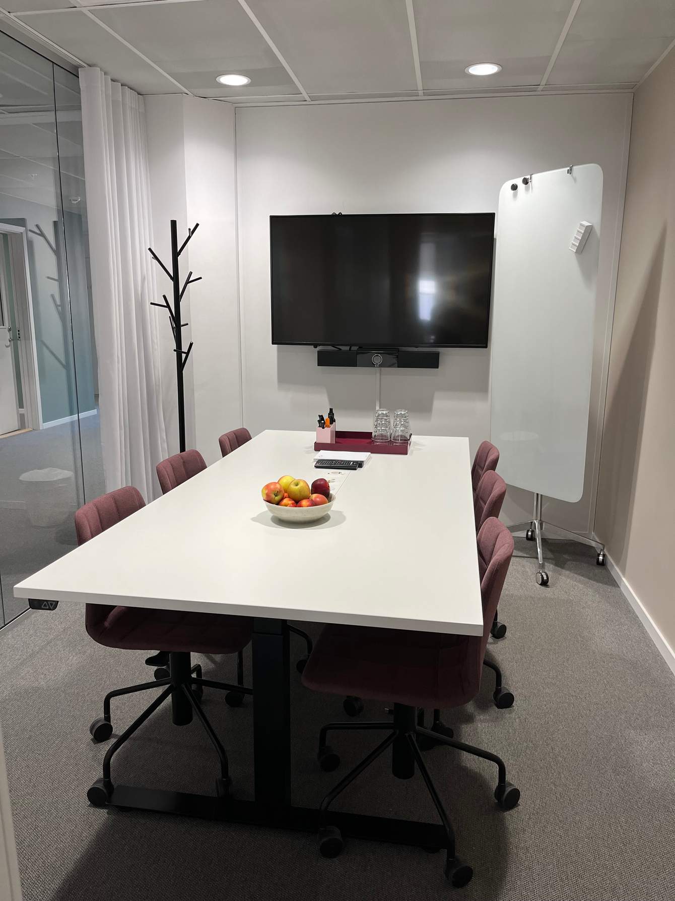 Charming meeting space with a floor-to-ceiling glass wall, suitable for gatherings of up to 4 people. The room is equipped with a whiteboard, screen, and video camera.