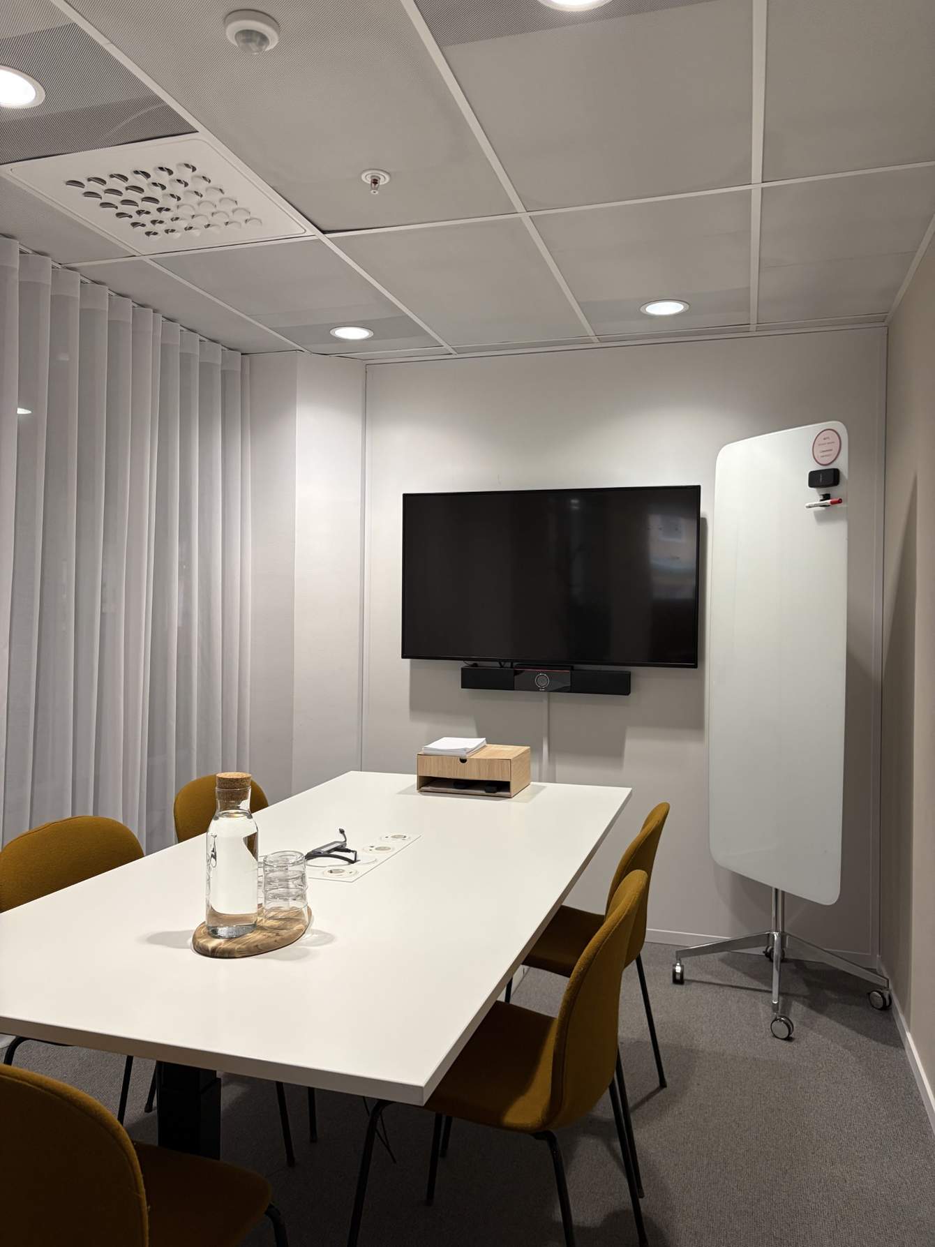 Ett modernt och stilrent mötesrum med plats för upp till fyra personer. Här finns även whiteboard, skärm för digitala möten, bra belysning och gardiner för avskildhet. En lugn och professionell miljö som passar perfekt för samtal, intervjuer eller mindre teammöten.