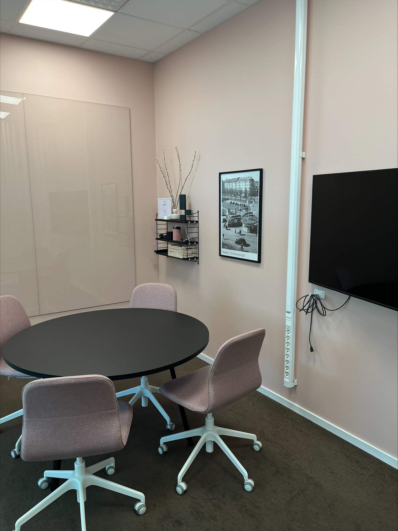 Mindre mötesrum på 10 kvm med runt bord som passar möten upp till 4 personer. Rummet är utrustat med TV-skärm och whiteboard. Extern kamera samt högtalare finns till förfogan.
