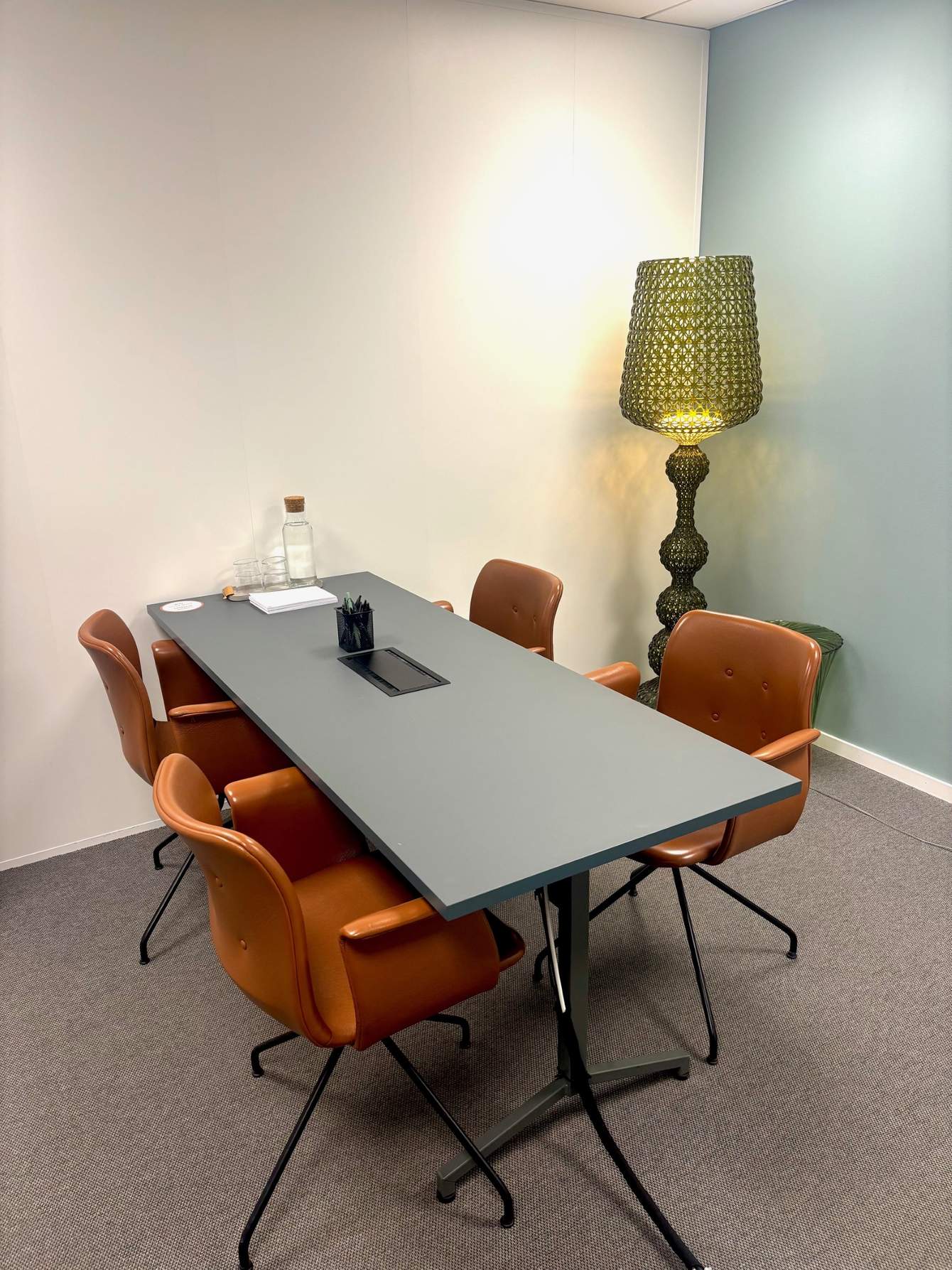 Med sin frodiga växtlighet i taket och naturliga ljusinsläpp erbjuder detta rum på 18 kvm en fräsch och inspirerande miljö som genomsyras av lugn och kreativ energi. Den gröna mattan och de omslutande gröna väggarna skapar en harmonisk atmosfär som både främjar produktivitet och inspirerar till nytänkande. Perfekt för kreativa möten : Rummet är optimalt för styrelsemöten eller workshops för upp till 8 personer. Det är utrustat med en modern TV-skärm, blädderblock och whiteboard, vilket gör det enkelt att hålla engagerande och effektiva möten. Här får ditt team chansen att blomstra i en omgivning som stimulerar både sinnet och arbetsglädjen. Boka idag och upplev hur en grön och inspirerande miljö kan göra skillnad för ditt möte