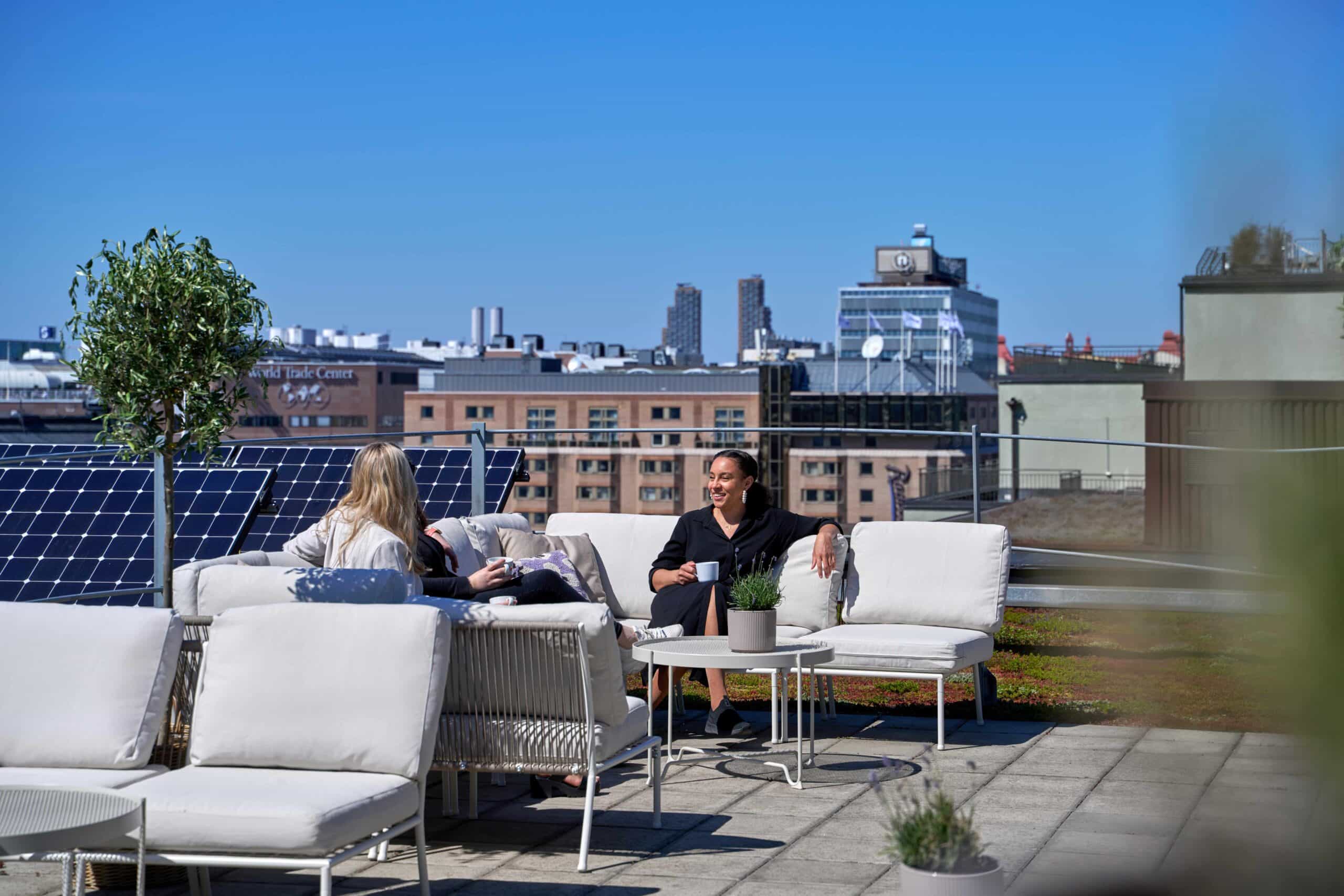 Utsikt, terrass och gemensamma ytor som gör arbetsdagen lite bättre.