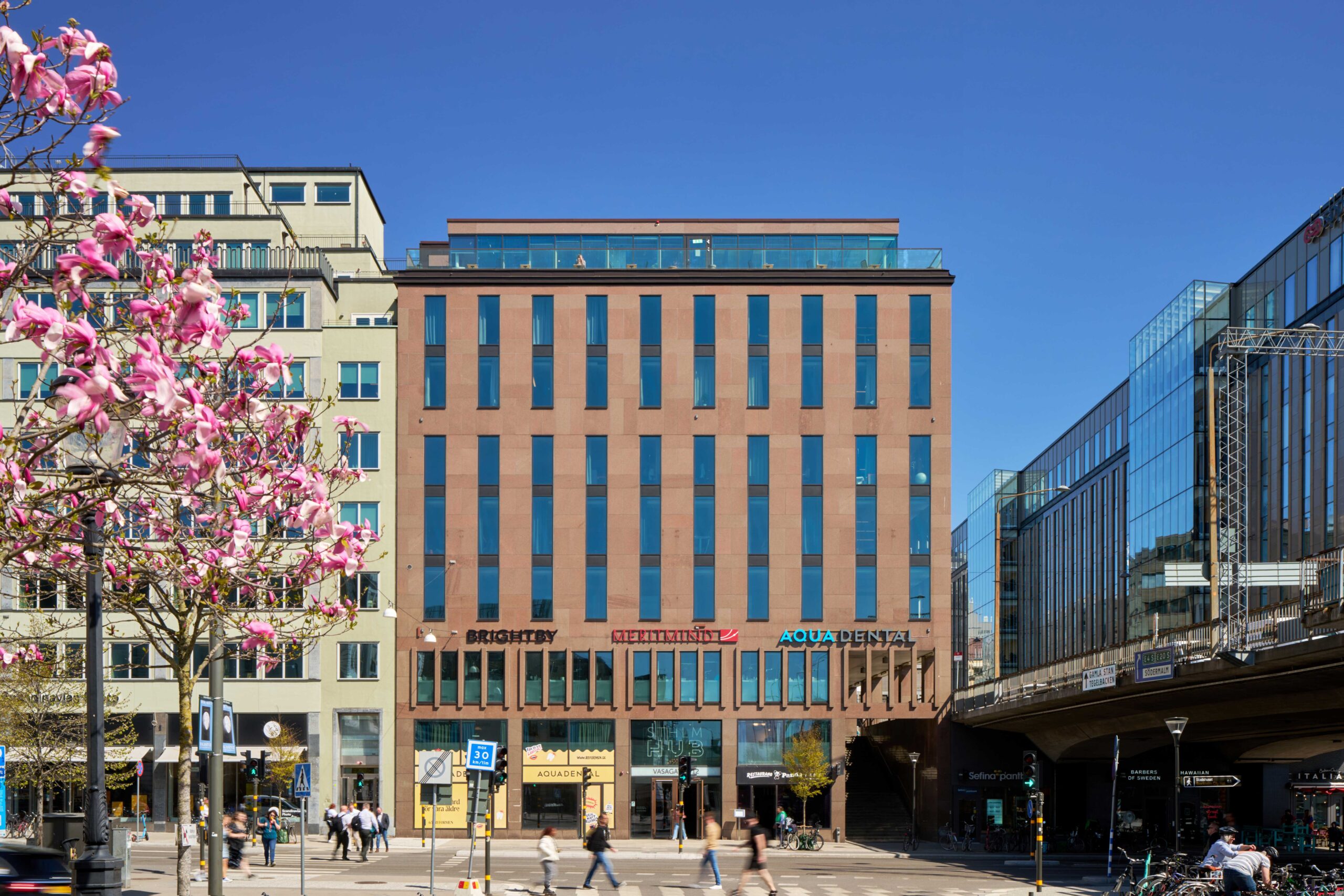 Fyra våningsplan med kontor i en representativ miljö. Takterrass, gemensamma ytor och allt du behöver precis runt hörnet.
